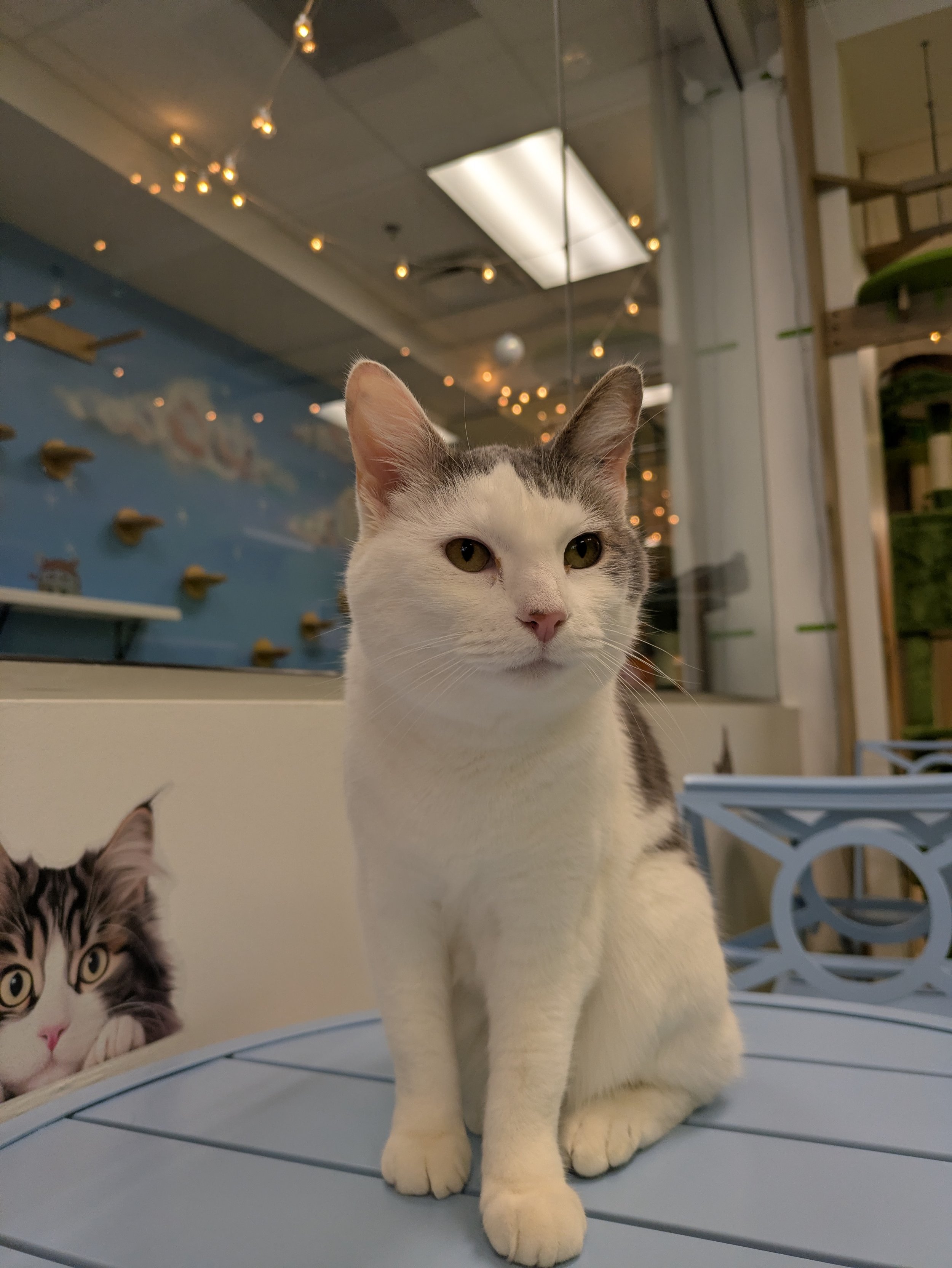 Lushi is a black Scottish Fold! She’s very sweet and affectionate and has the cutest little chirp ever. She likes to watch the action from a distance but loves to say hi and play with our visitors.
